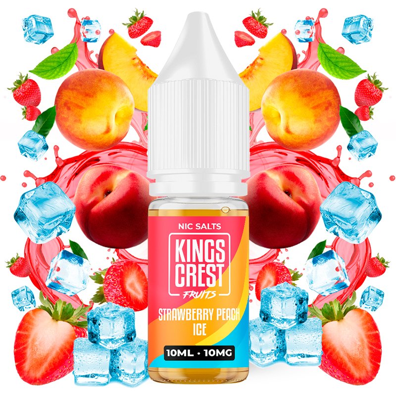 El líquido Strawberry Peach Ice de la gama Fruits de Kings Crest Salts recrea la dulzura de las fresas maduras y de los suculentos melocotones, equilibrados para crear una sinfonía en el paladar. Como toque final, un vigorizante frescor helado.